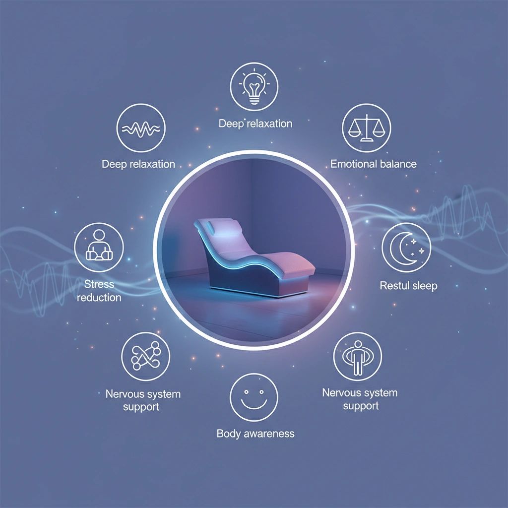 Vibroacoustic therapy is designed to support relaxation and well‑being, not to diagnose or treat illness. For your safety, please consult your doctor first—especially if you are pregnant (first trimester), have very low blood pressure, PTSD, or a history of blood clots or thrombus.